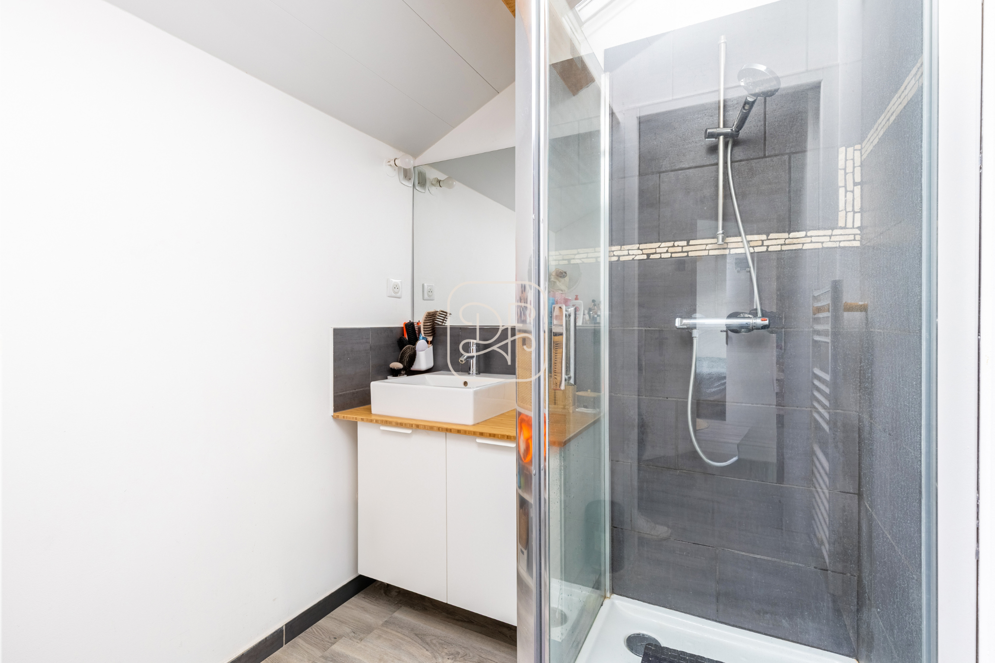 À l’étage deux chambres spacieuses, dont une avec terrasse plein sud, un bureau ou dressing selon vos besoins, salle d’eau et les toilettes indépendantes.